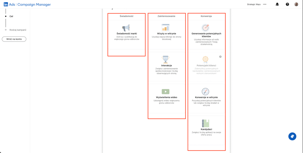 LinkedIn Ads to w pełni rozwinięty system reklamowy, umożliwiający prowadzenie kampanii z różnymi celami – od budowania świadomości marki, przez generowanie ruchu na stronie, aż po pozyskiwanie leadów czy rekrutację. Tak jak w innych ekosystemach reklamowych, cele ułożone są w strukturę lejka marketingowego – co pozwala na budowanie całego customer journey w ramach jednej platformy: